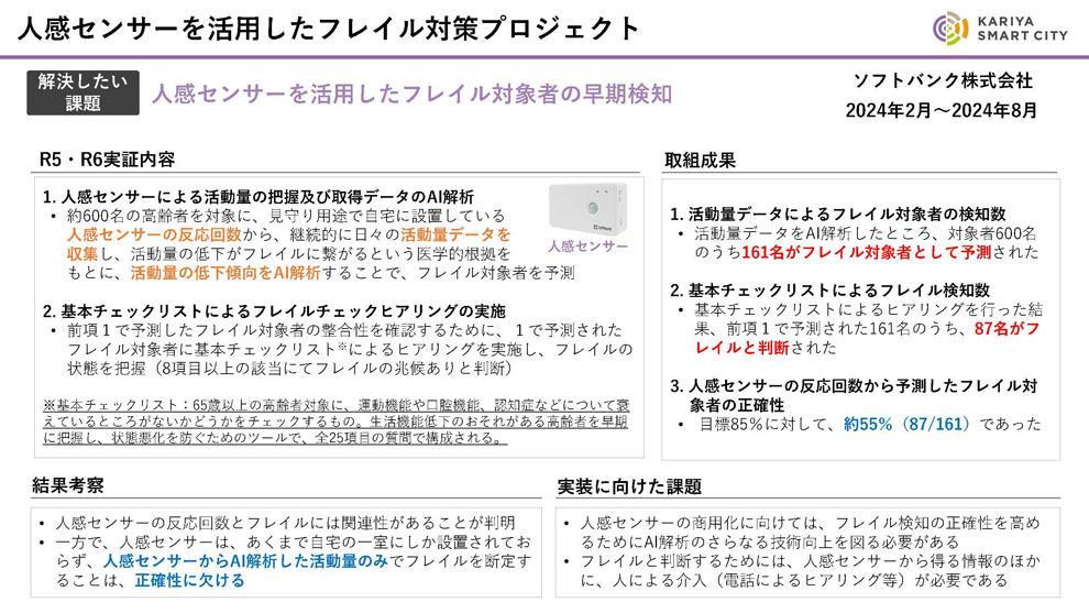 今回、高齢者見守り安心機器利用者を対象に、既設の人感センサーにより、高齢者が健常の状態から、フレイル、要支援、要介護への遷移と人感センサーの反応回数に相関関係があるかをAI技術を活用して検証します。