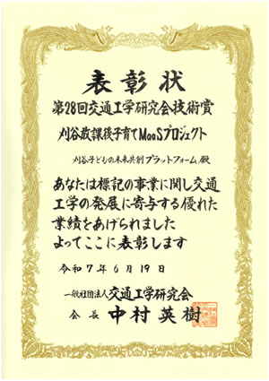 このたび、刈谷放課後子育てMaaSプロジェクト(2023)が第28回交通工学研究会技術賞を受賞しました。1997年度より設けられた技術賞は、過去暦年1年間に機関誌「交通工学」に掲載された紹介・報告、または自ら応募あるいは会員推薦の業績の中から、交通工学の発展に顕著な貢献を成した実務的、先進的な技術や施策への取組に対して選考されるものです。